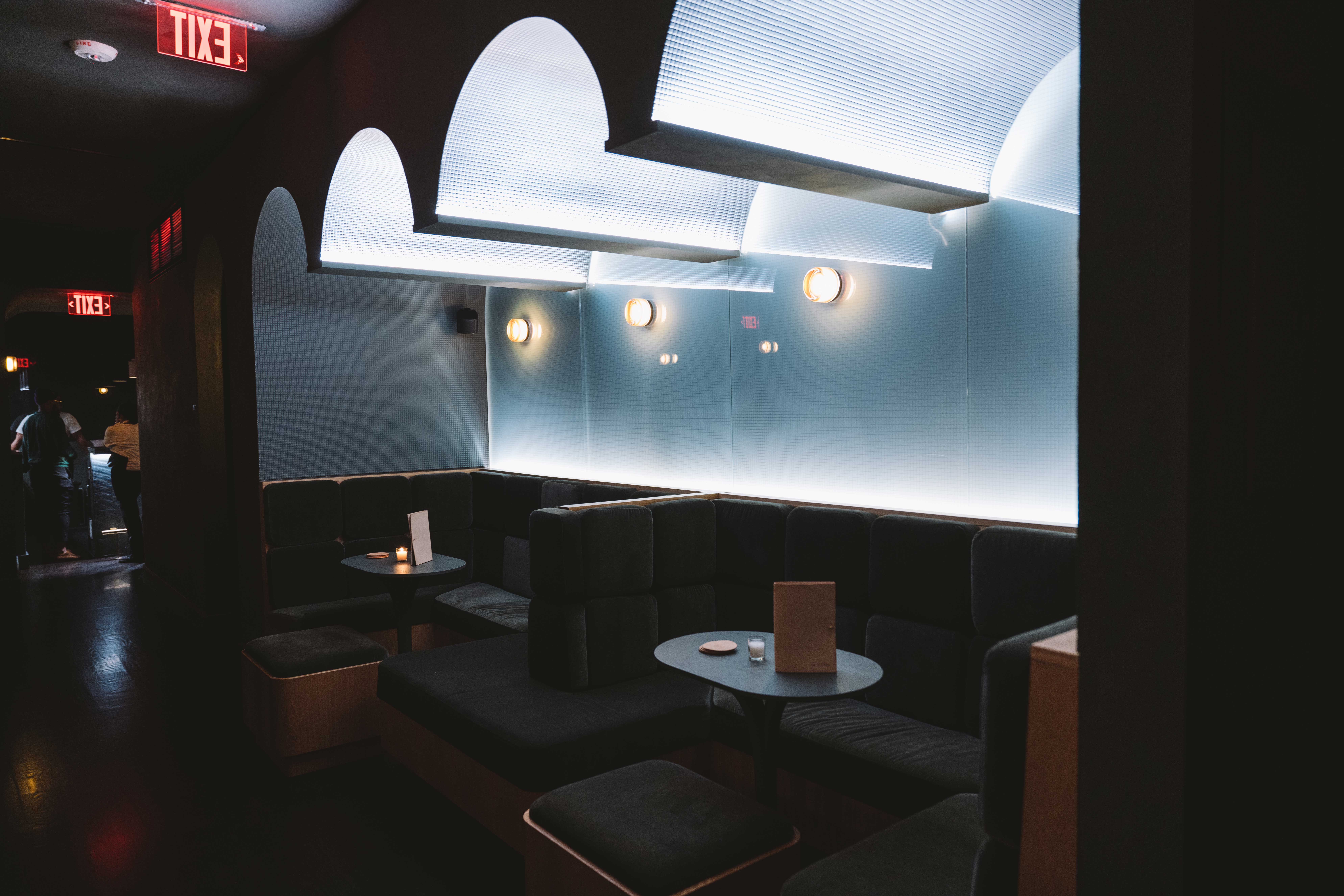 In the lounge area, two u-shaped banquettes are framed beneath a vaulted, tiled ceiling, and provide an intimate group setting while echoing the architectural elements of the ground floor. Opposite the banquettes, smaller tables are positioned around two fireplaces and custom drink rails line the wall to provide standing room on busier nights. At the back of the space, a window booth can be converted into a DJ booth or staging area and large tinted mirrors help open the space.