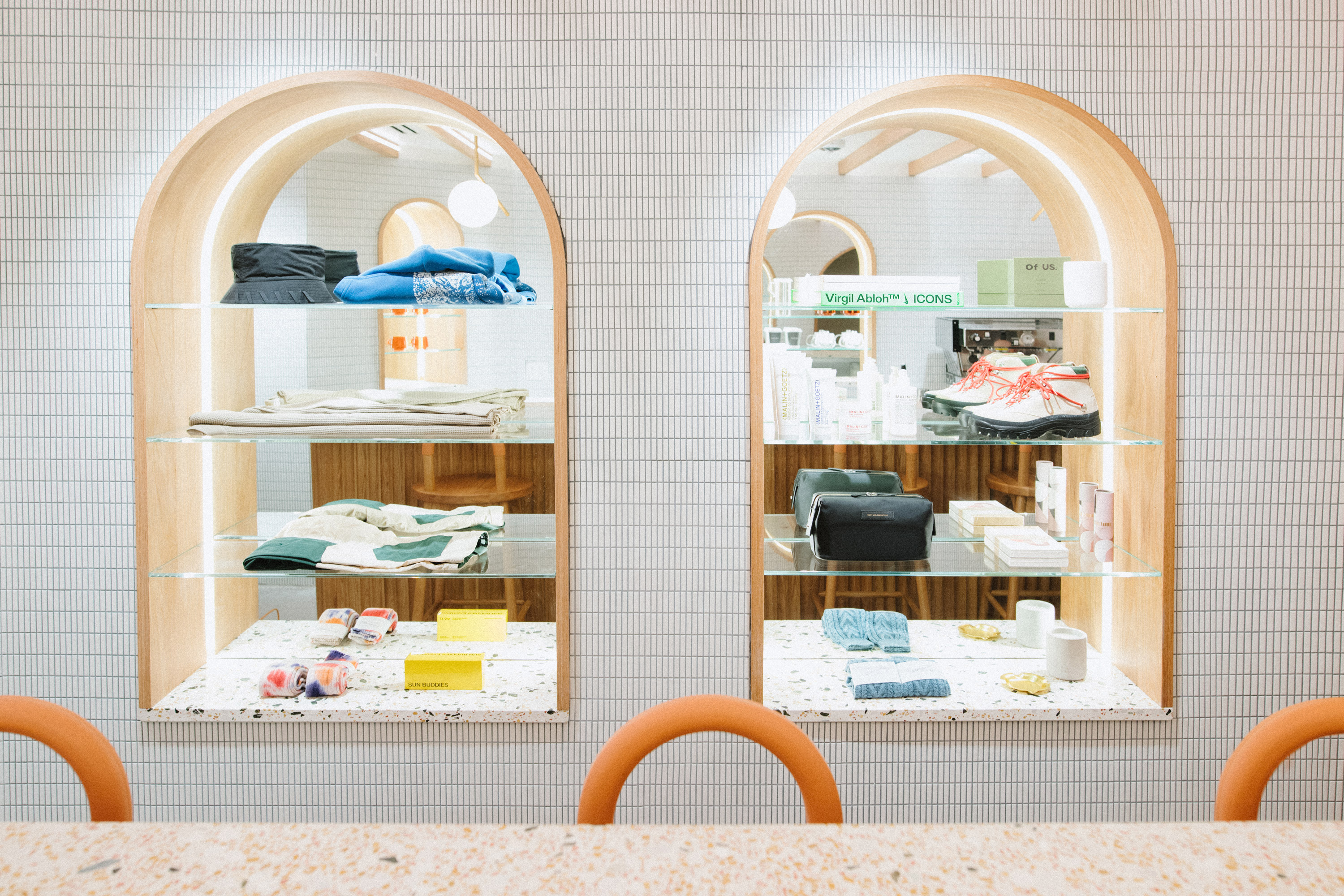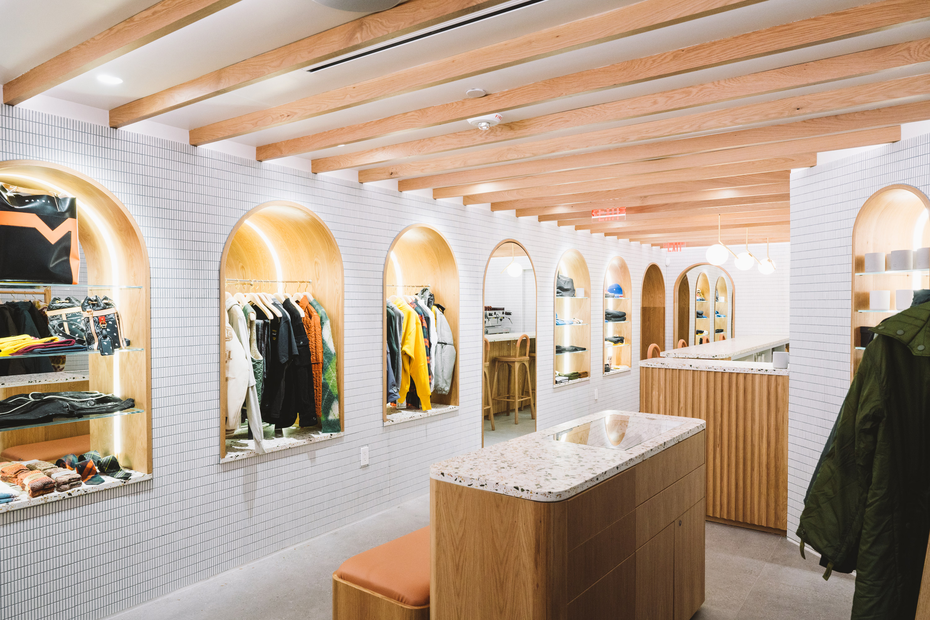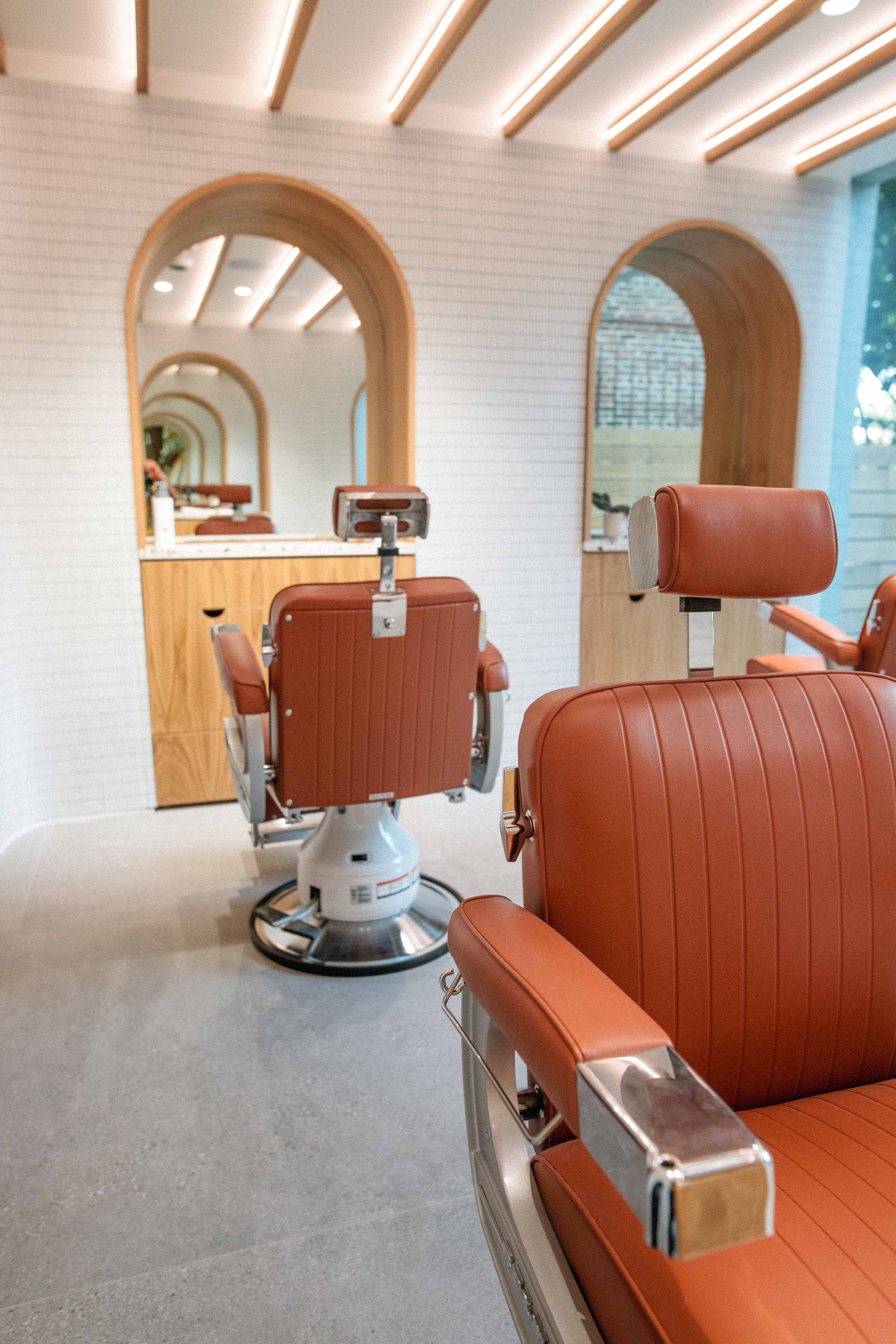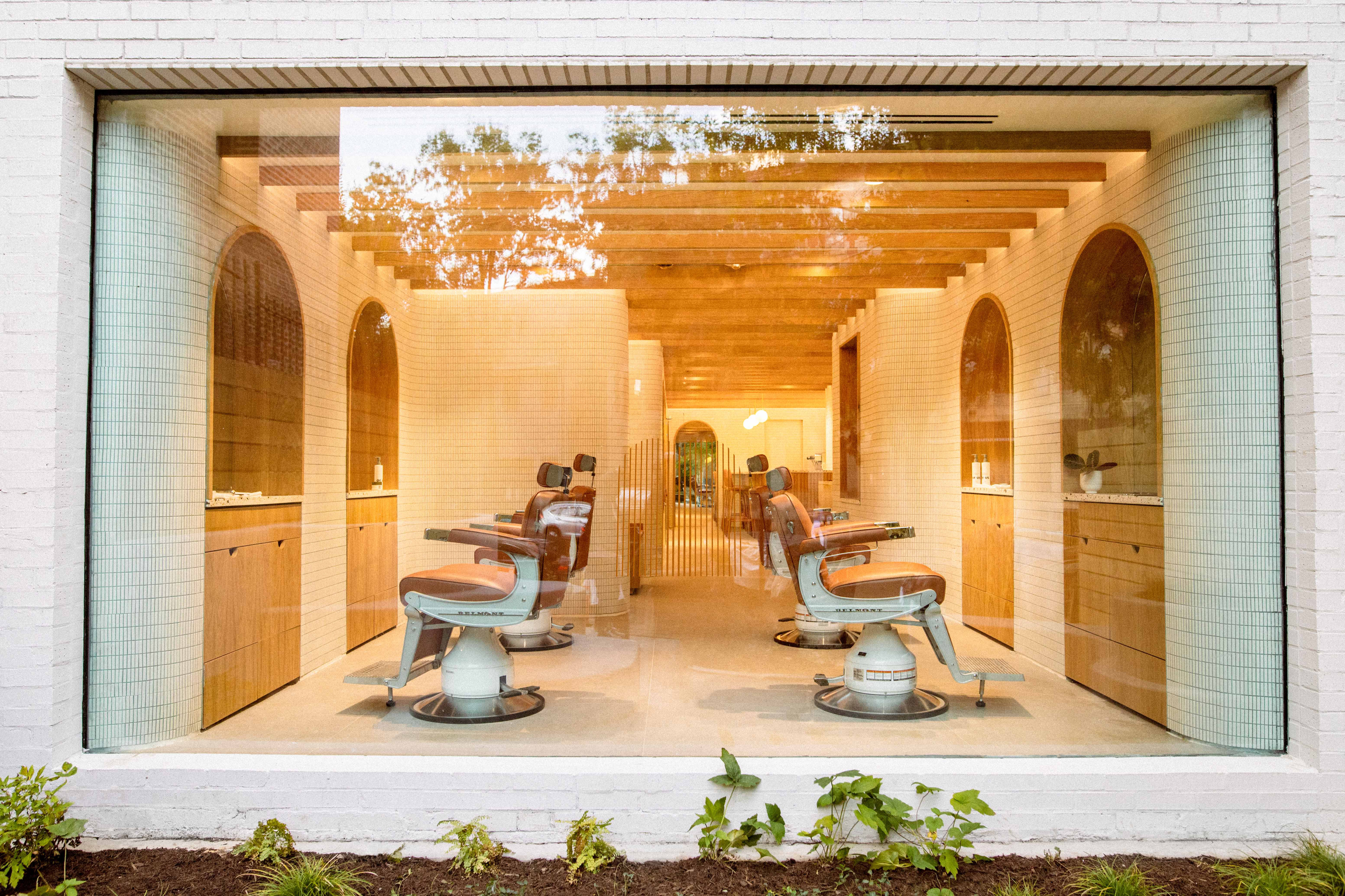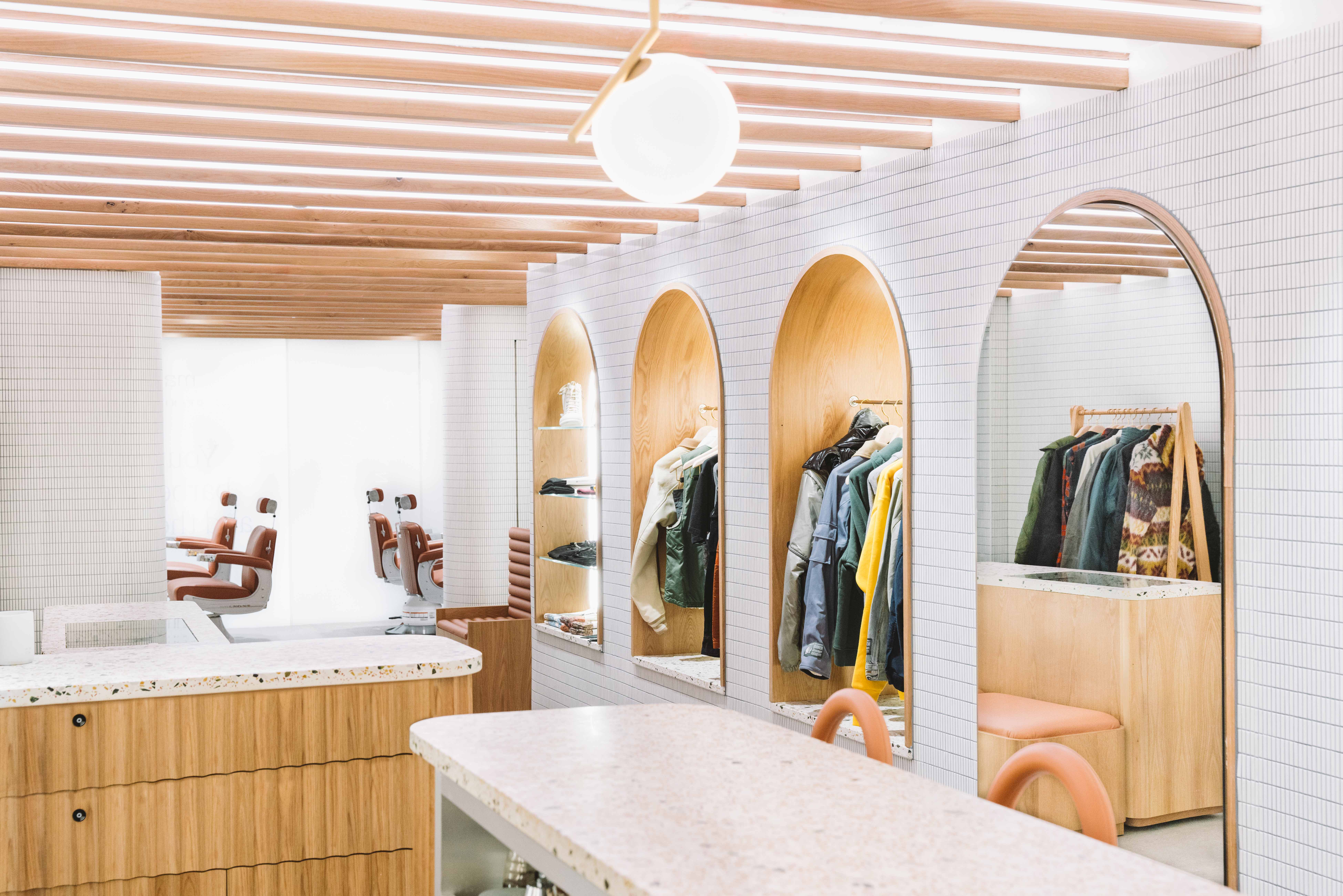 The front of the ground floor space features four custom barber stations that look onto the outdoor garden space. Beyond the barbershop, the retail space features oak and mirror niches for a curated selection of fashion, home goods and wellness products. Directly across, a bespoke terrazzo bar and stools were made for the cafe area. Gently curved walls constructed from white stacked tile help define and connect the environments, while oak paneling creates contrast and brings warmth to the space. To offset the low ceiling height, oak baffles with integrated LED strips reflect light into the space during the day and can be dimmed in the evenings for speakeasy visitors.