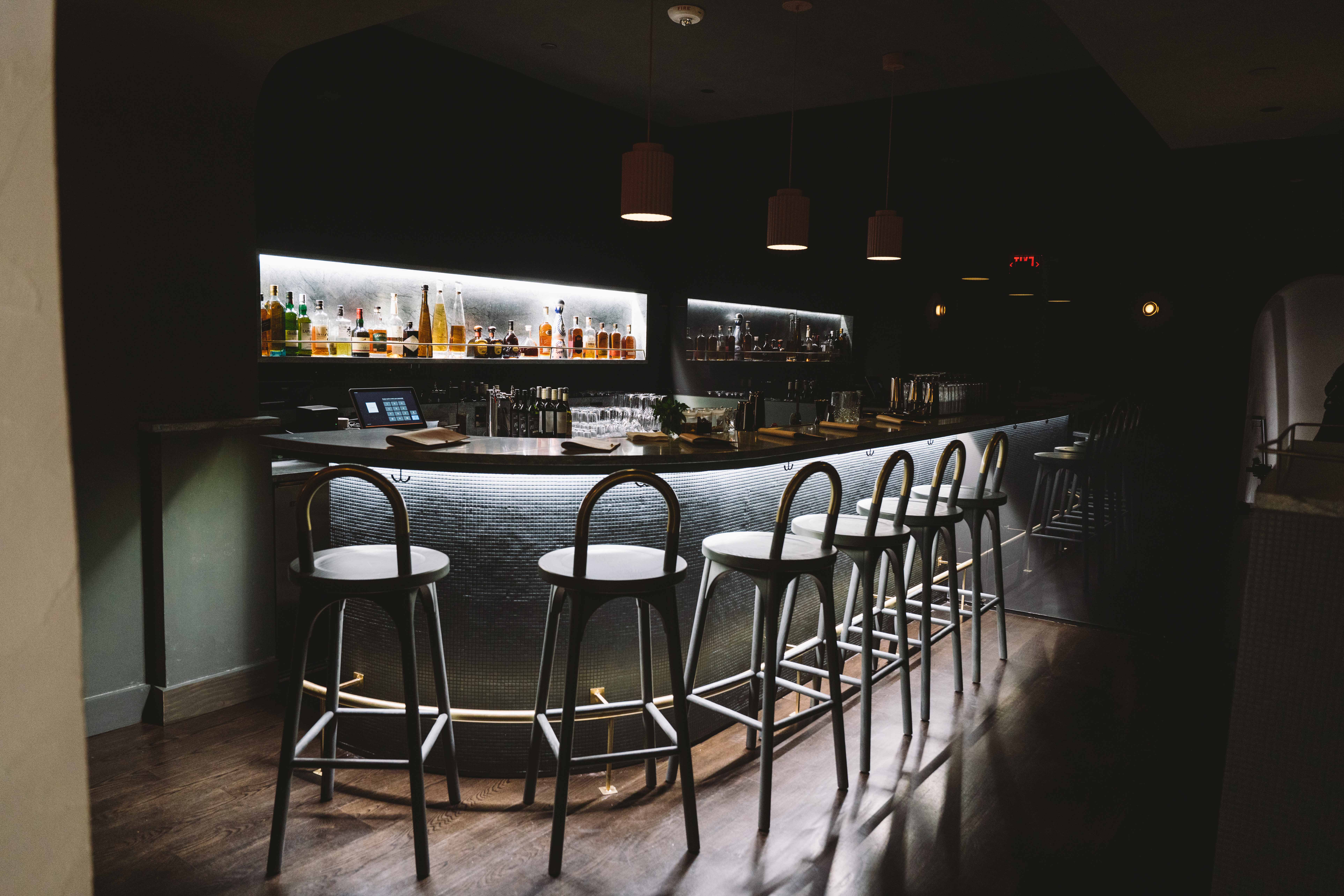 The previous life of the space as a residence inspired an environment that feels comfortable, charming, yet unexpected. Green venetian plaster finishes the curving walls that line the entirety of the space, and a green mosaic-tiled bar is paired with custom stools that reference the cafe seating downstairs.