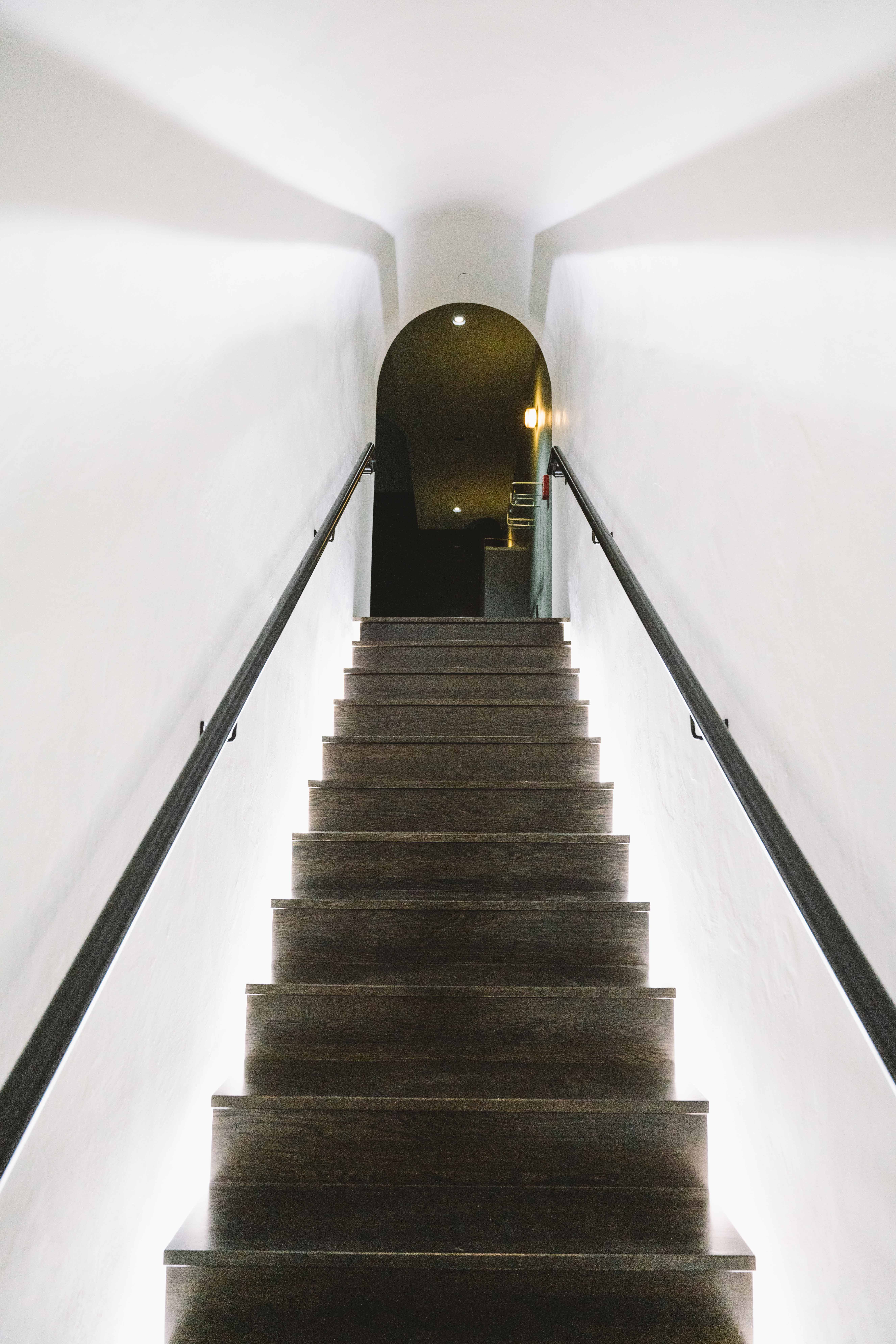 Hidden between two retail niches, an arched mirror swings open at the touch of a button to reveal a secret entrance to Out of Office, the second floor speakeasy that is accessed via an illuminated staircase.