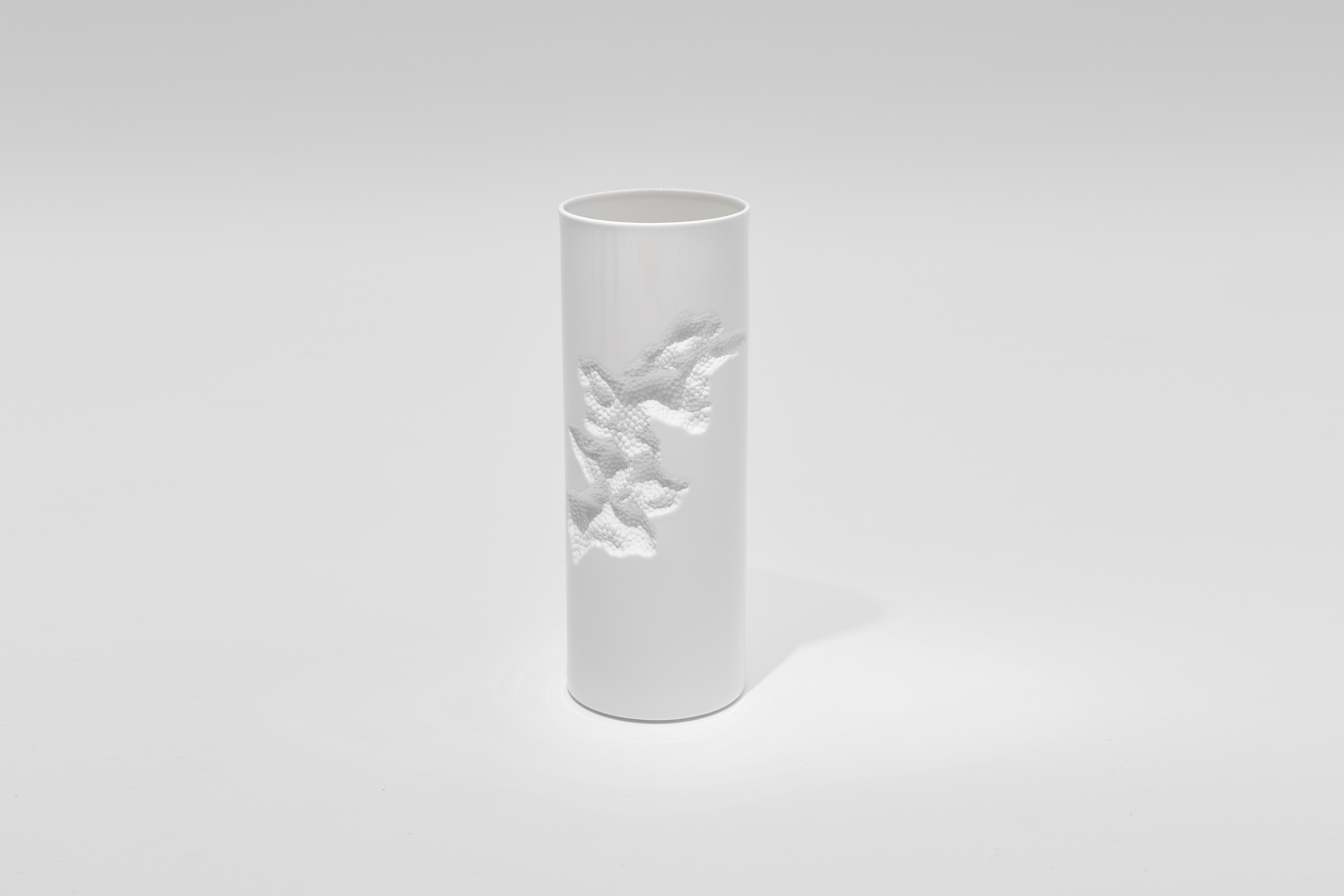 Both Positive and Negative also play on the fragility and solidity of bone china. The edge of Positive's cylindrical form appears as a thin surface, while inscribed into its surface is an unexpected interruption. A small volume is excavated from the side of the vessel, leaving an irregular textured surface that plays on the idea of a broken vase while contrasting with the smooth cylindrical surface of the piece.